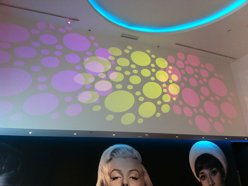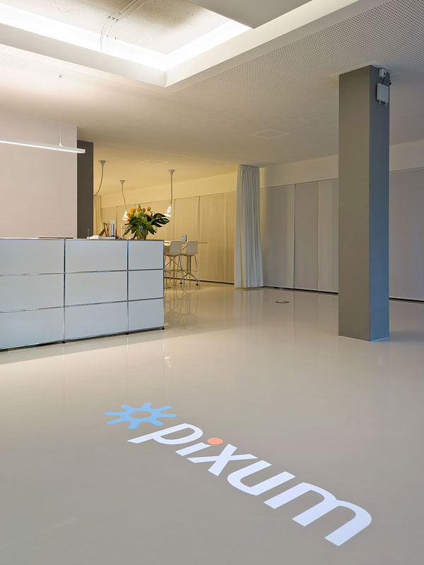 The device is installed at an almost invisible position under the ceiling near the entrance. Using a deflection mirror, it projects the coloured Pixum logo onto the floor. Thanks to LED technology and the use of a glass gobo, the system requires very little maintenance, consumes only small amounts of energy and has an expected life of 30,000 operating hours.