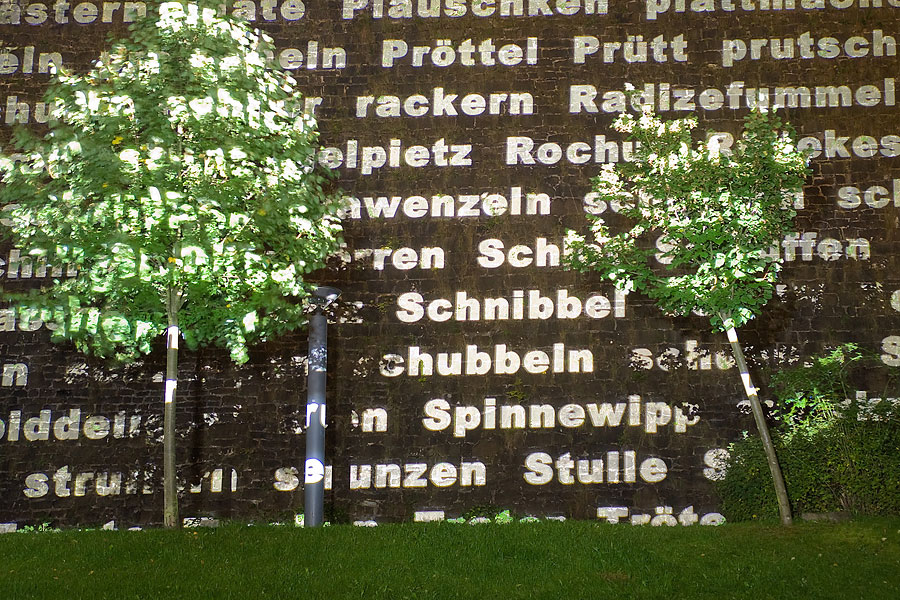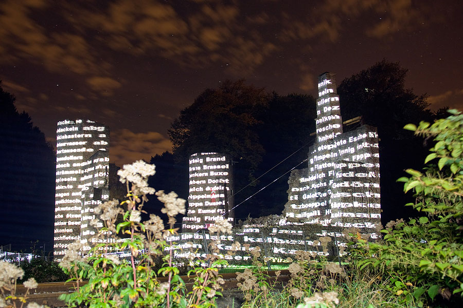 Using powerful outside projectors provided by Derksen Lichttechnik Kaufmann projected words with the Ruhr areas particular accent onto the buildings. Ten projectors were needed to cover the whole area and working hand in hand with the artist the projected words were eventually seen in what appeared to be a seamless flowing text. The inevitable blurring which would have occurred because of the different stand points of the projectors was pre-calculated and measured to prevent it.