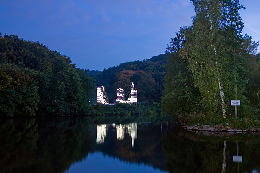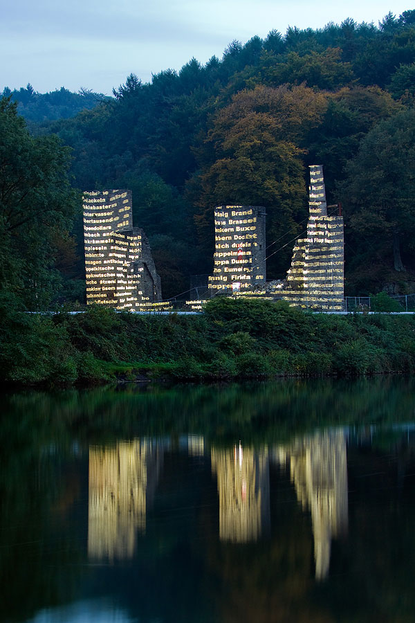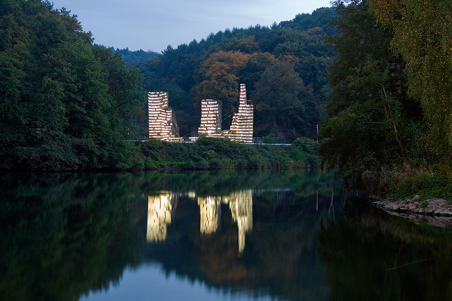 Andreas M. Kaufmann has in the frame of his project “Dem Ort seine Sprache” (The place of their speech) illuminated two particular constructions on the Ruhr. The first is an old industry wall on the Heinrichshuette in Hattingen and the other is the ruins of castle Hardenstein near Witten, both lying directly on the banks of the Ruhr.