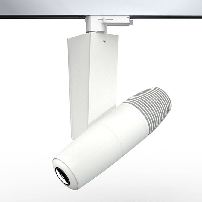 High brightness projector for large images. For mounting on 3-phase lighting tracks. The projection template (gobo) can be changed without any tool. The image is focussed by turning the lens.